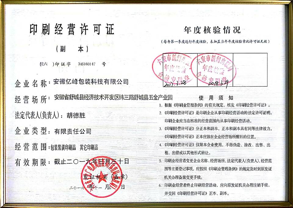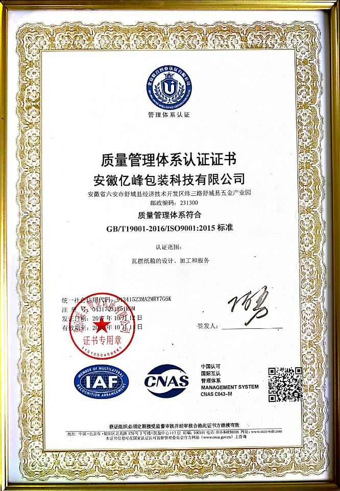 安徽亿峰包装科技有限公司成立于2016年元月,是一家专业从事三层、五层、七层水印和胶印瓦楞纸箱的生产及销售企业。公司位于舒城县经济开发区,毗邻206国道离京台高速30公里。环境优美,交通便利,地理位置优越。我公司拥有优质的生产设备、高素质的员工团队、严格完善的规章制度。已获得安徽省出入境检验检疫局考核通过,成为全国危险品瓦楞包装定点生产企业;2017年10月份取得ISO9001质量管理体系认证证书。